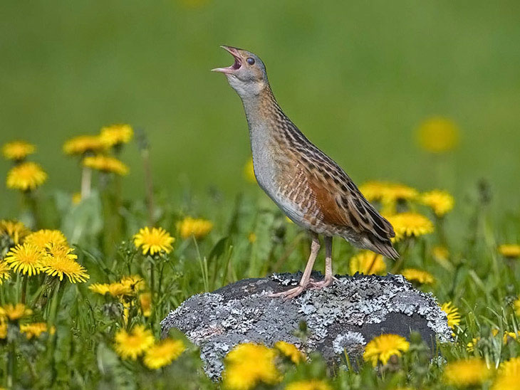 Влітку на заплавних луках чути дивне деренчання. Це крики деркача – птаха-пішохода. Змусити його злетіти – важка справа та і літає він погано. Деркач прошмигне в траві тихенько і сховається…