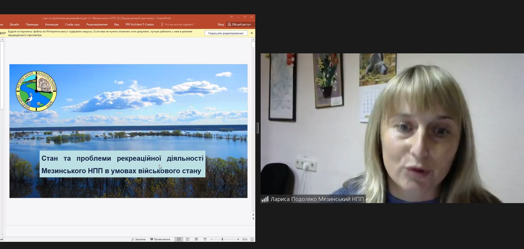 Подоляко Лариса, заступниця начальника відділу еколого-освітньої роботи та рекреації Мезинського парку розкрила проблематику з теми «Стан та проблеми рекреаційної діяльності Мезинського НПП в умовах військового стану».